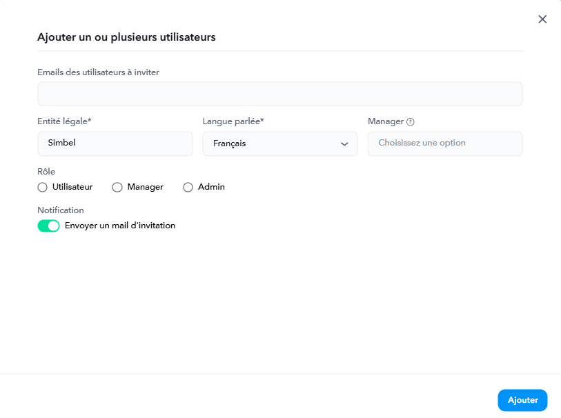 Un administrateur peut, s'il le souhaite, envoyer une invitation lorsqu'il invite un ou plusieurs utilisateurs via le menu "Utilisateurs" et le bouton "Ajouter" en haut à droite, puis en laissant activée la notification (toggle vert)