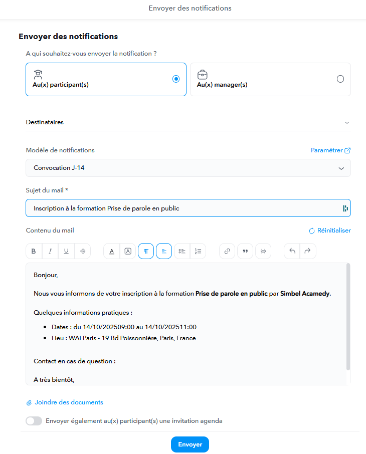 Si les dates ou heures d'une session sont modifiées, l'utilisateur à qui vous avez déjà envoyé une invitation calendrier via la plateforme va recevoir un mail mettant automatiquement à jour cette invitation calendrier. Vous pouvez accompagner ce mail d'une notification additionnelle en cliquant sur Notifier quand la pop-up s'affiche.