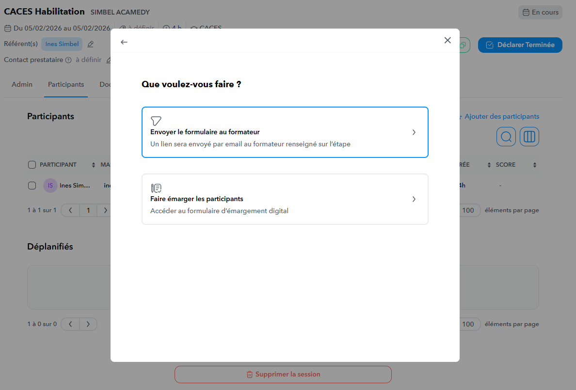 - Choisir Envoyer le formulaire au formateur ou faites signer directement les participants