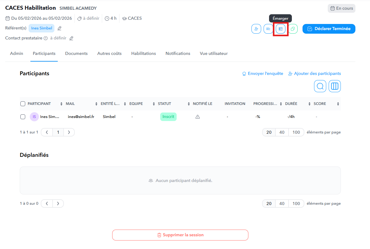 Lorsque vous êtes prêt, cliquer sur "Ouvrir l'émargement pour les participants" (vous pourrez le faire pour matin et après-midi selon les horaires de votre session).