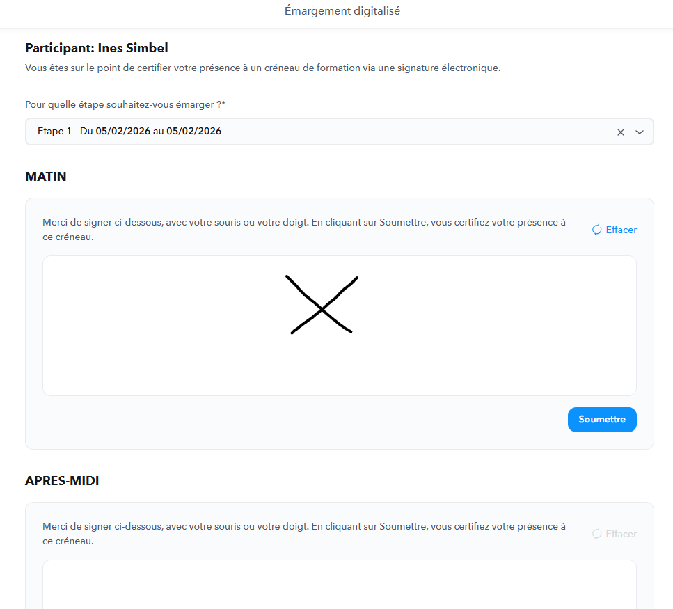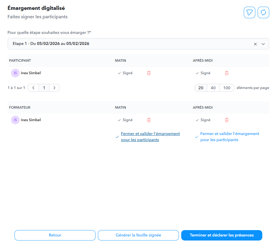 Vous avez ensuite la possibilité de modifier les présences si vous avez des changements de présence à noter puis générer la feuille signée qui s'affichera dans les documents de la session.