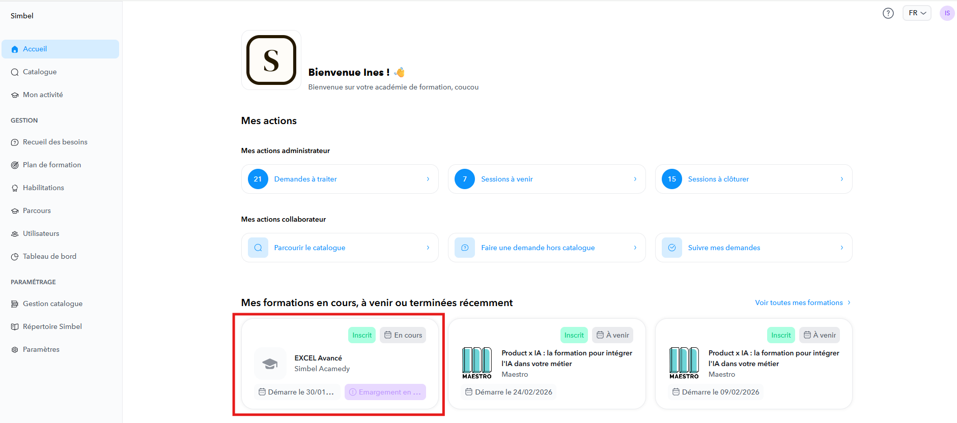 - Sur la page d'Accueil, retrouvez la formation pour laquelle l'émargement est ouvert. Un encadré violet permet de l'identifier facilement. (Elle se trouve également dans Mon activité)