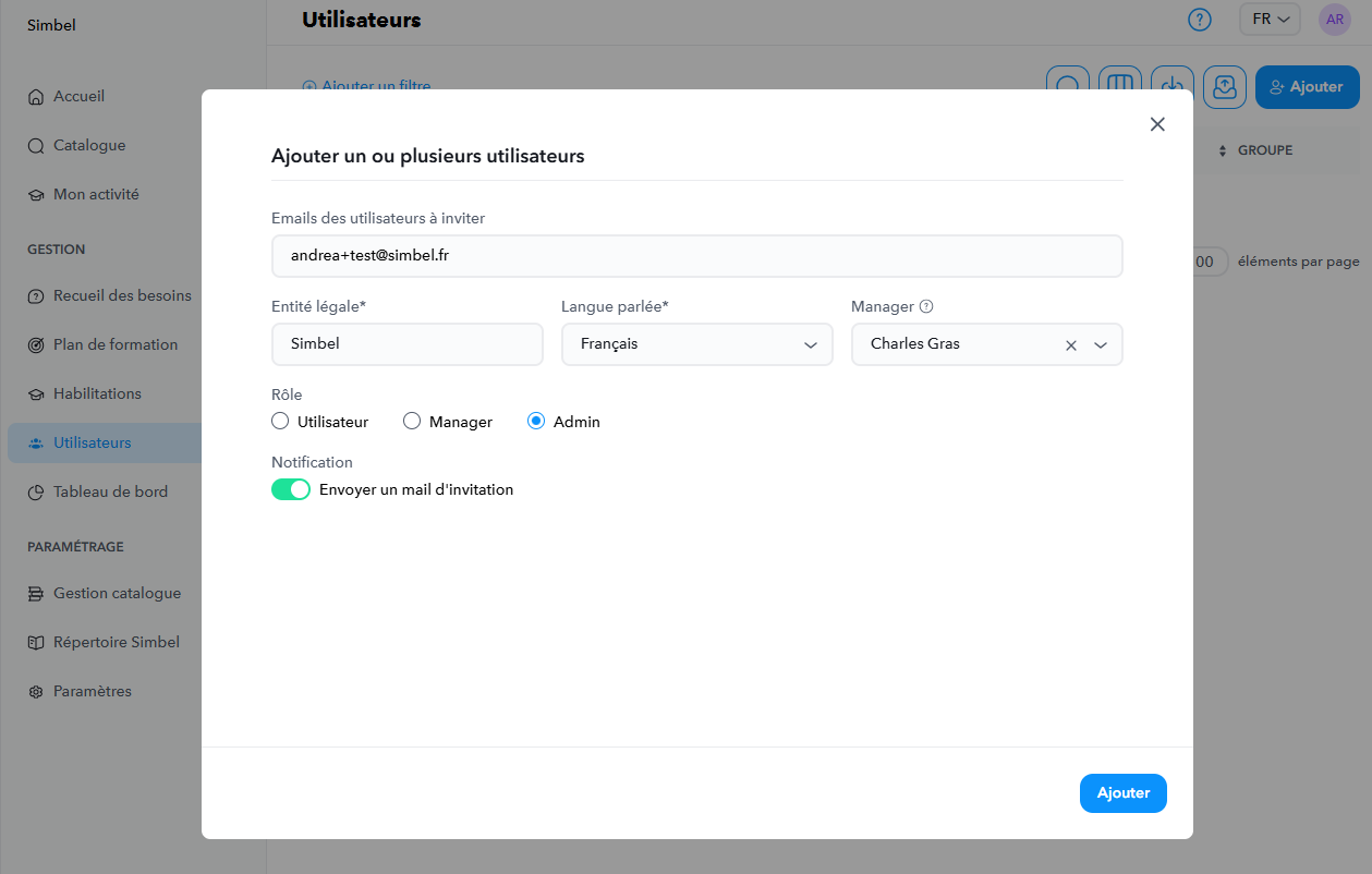 En tant qu'administrateur ou administrateur de groupe, vous pouvez à tout moment créer les comptes pour un ou plusieurs utilisateurs sur Simbel en saisissant leur mail ou matricule (en fonction de ce que vous utilisez comme identifiant unique) via l'onglet Utilisateurs.