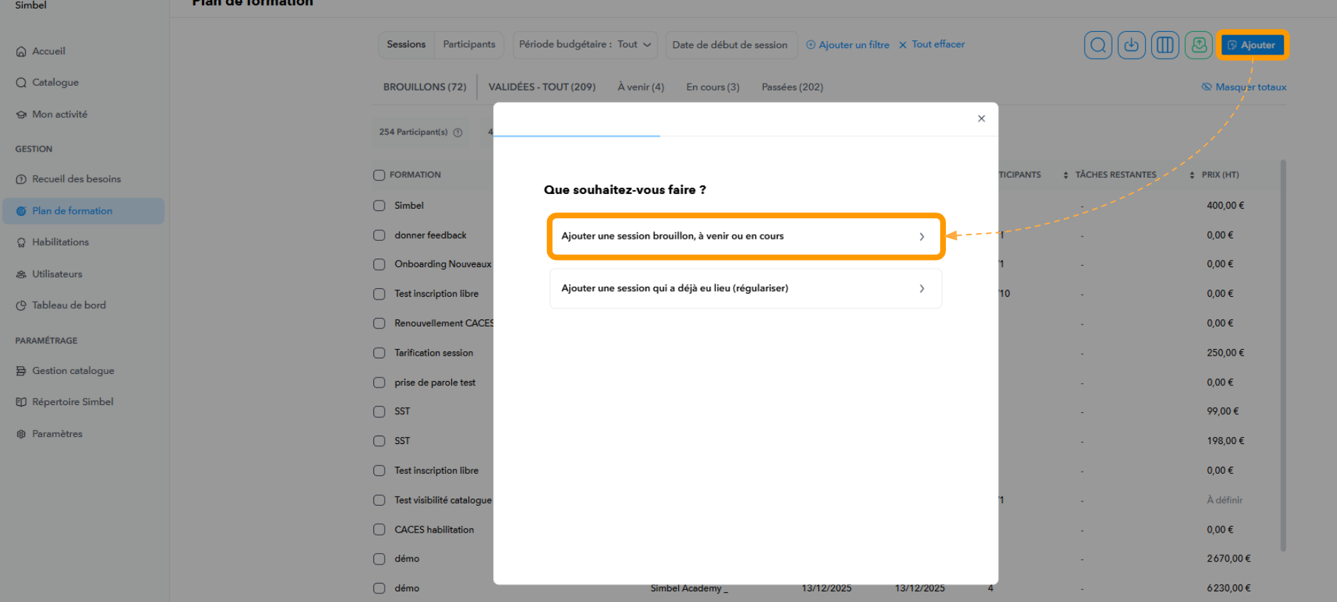 - Ajouter une session qui a déjà eu lieu (régulariser) : Aucun participant ne sera notifié et la session apparaîtra au statut “Terminées”
