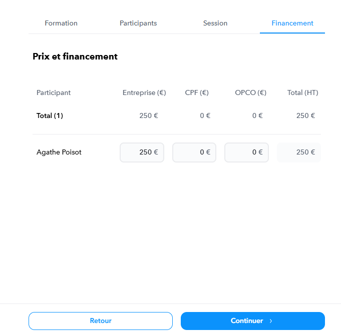 Cette dernière étape vous permet de renseigner les informations relatives au prix de la session confirmée :