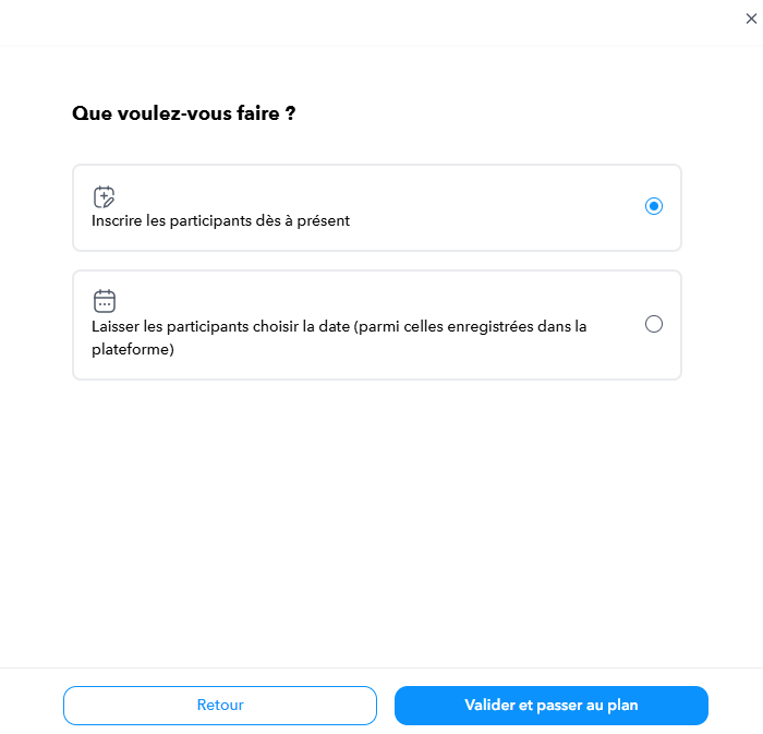 - Vous voulez ajouter un ou des participants sur une session confirmée à venir ou en cours = cette session est validée au plan