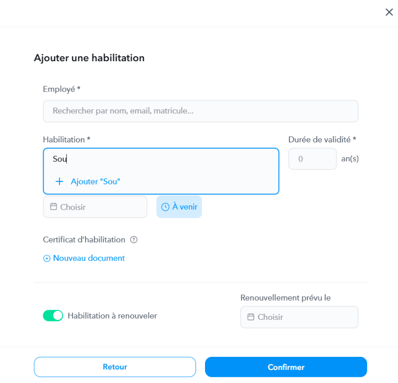 Pour ce faire, rendez-vous dans la section "Habilitation", puis cliquez sur "Ajouter". Sélectionnez l'employé concerné, indiquez le nom de l'habilitation, puis cliquez sur "ajouter".