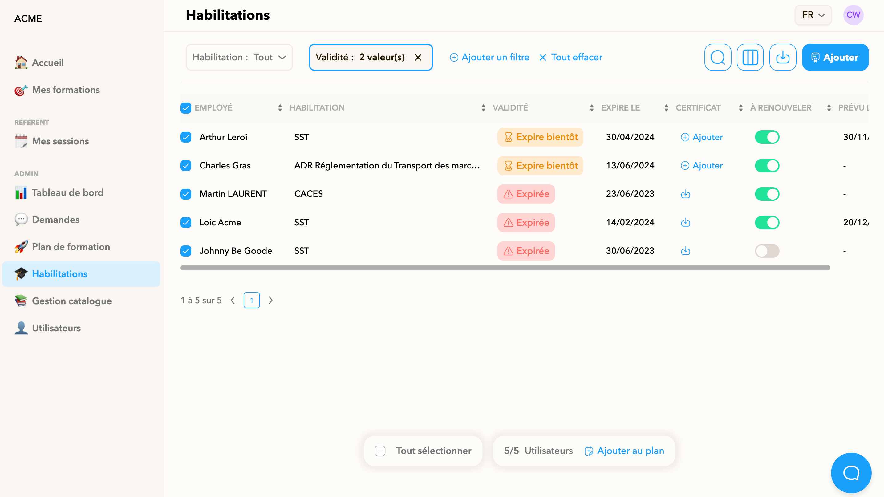 💡 Depuis votre liste d’habilitations, vous pouvez en un clic organiser le renouvellement des habilitations expirant bientôt :