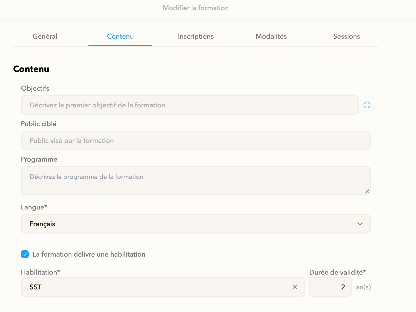 - Dans Gestion Catalogue, pour chaque formation qui délivre une habilitation, ajoutez cette information dans l’onglet Contenu.