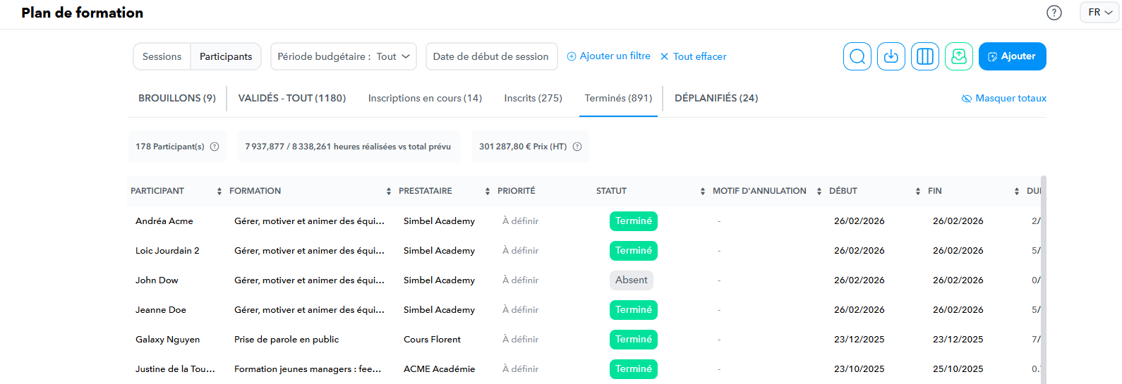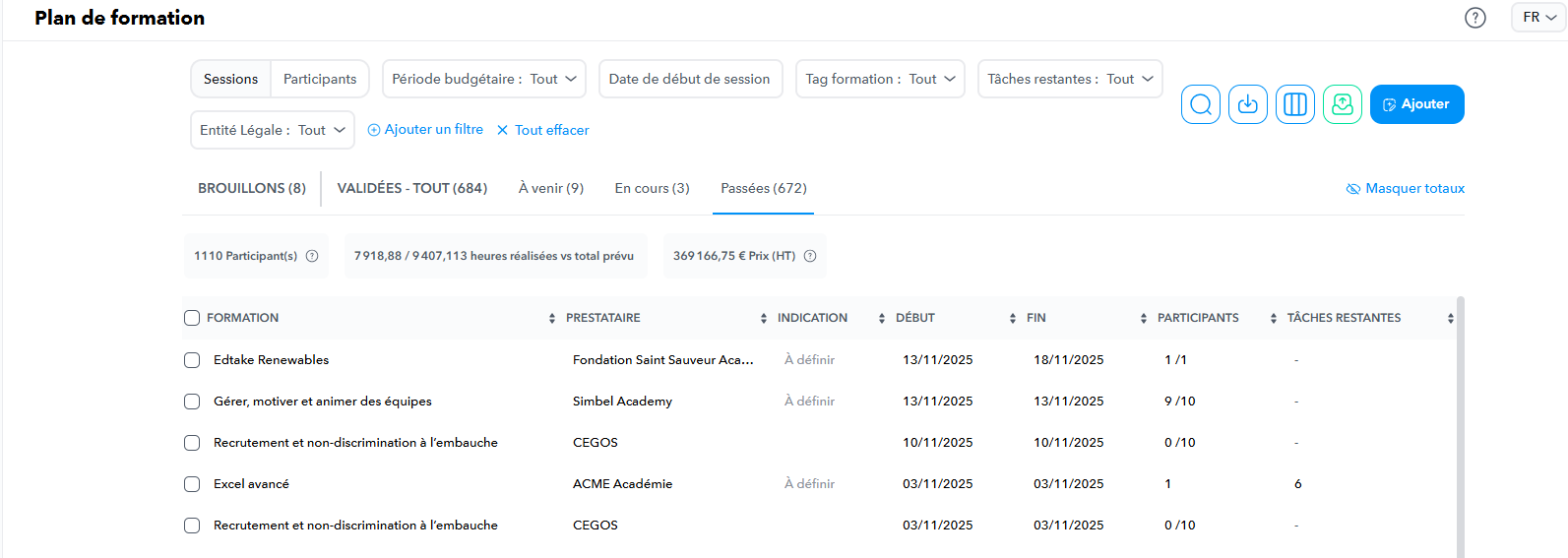 - Par session : 1 ligne par session de formation avec un accès direct à la page session