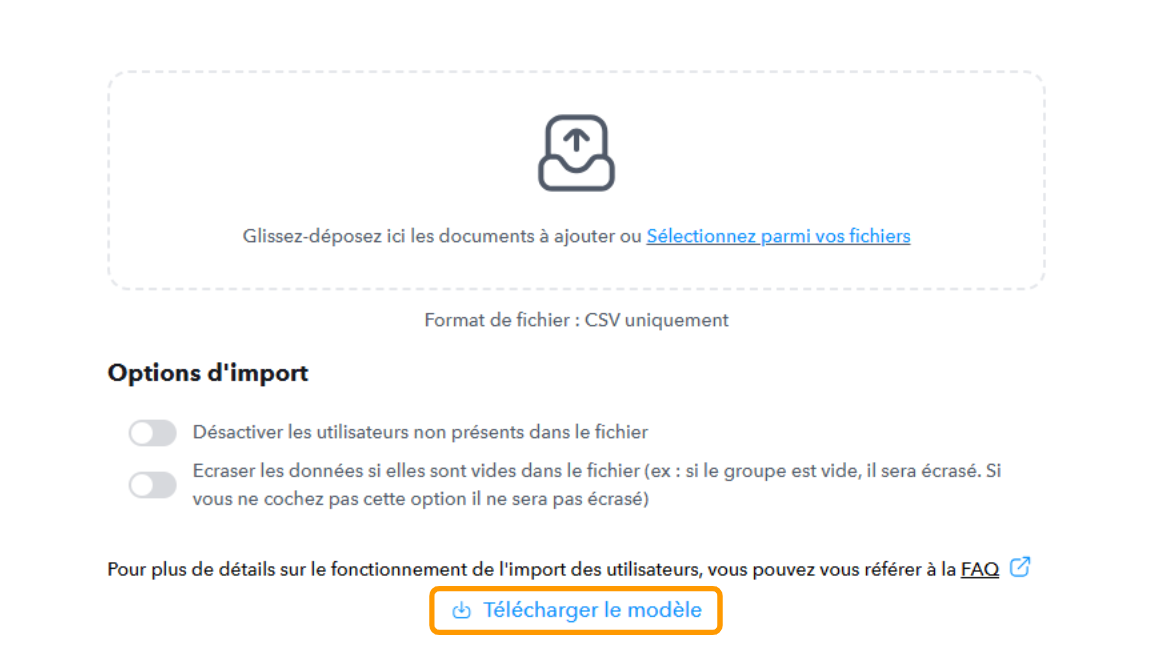 1/ Récupérez le modèle de fichier dans l'onglet Utilisateurs en haut à droite