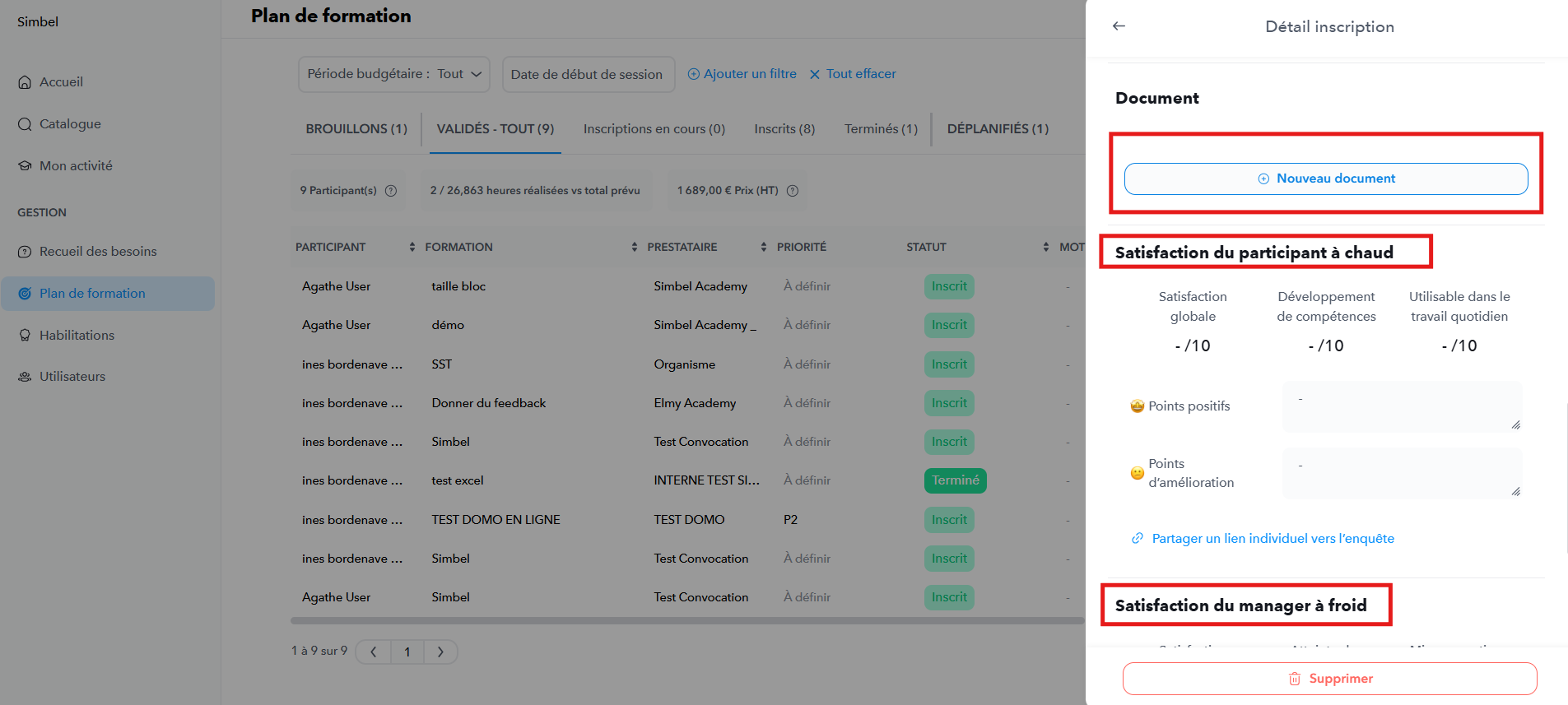 c) Dans le plan de formation, sur les inscriptions vous pouvez ajouter des document + consulter les résultats d'enquête de satisfaction